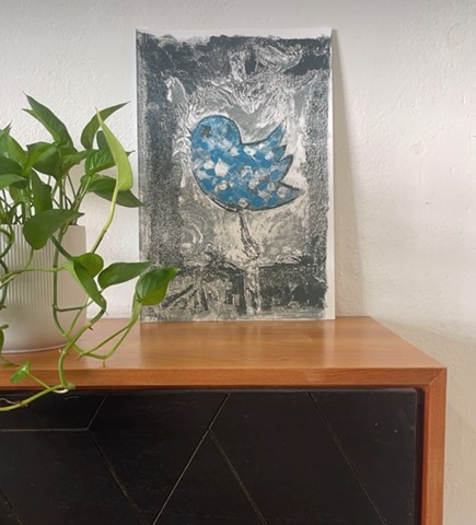The print revisits my Twitter Revolt bird with X eyes painting from 2014, which was exhibited at Oliver Francis Gallery in Dallas and it's in the collection of Rodney Rogers @rsrogerscollection in Dallas.